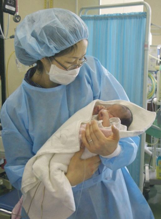 医師から説明を受けた後、理恵さんは初めて音十愛ちゃんを抱いた(2005年1月28日、高知赤十字病院新生児室、理恵さん提供)
