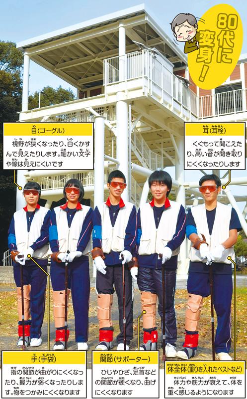高齢者疑似体験の装具を身に着けた防災いのぐ記者。後ろにあるのは浜の宮地区津波避難タワー