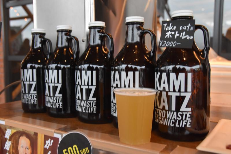 徳島から出店の「RISE & WIN Brewing Co.」では、こだわりのビールを提供。ゴミを出さない「ゼロ・ウェイスト」の理念をもっており、テイクアウト用のおしゃれなボトルも販売しています。