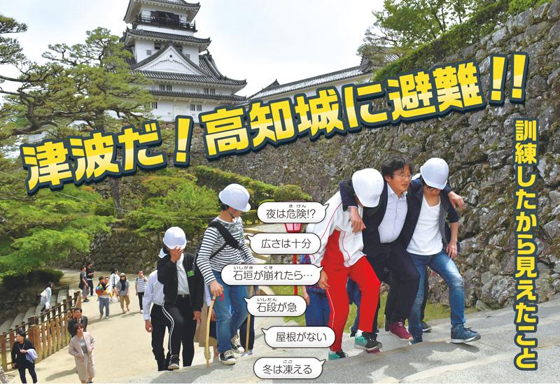 14人が参加。高知市本町3丁目の高知新聞社5階で、「長く感じた」揺れを会議用の長机の下で耐え、日曜市でにぎわう街中へ。200メートルほど離れた市の指定する津波避難場所、高知城へ逃げました。