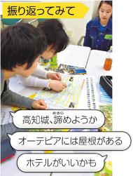 訓練の後はグループワーク。みんなの意見をまとめました。その後は、大槻知史准教授による講評。「避難先の候補をいくつか用意しておいて」などとアドバイスしてくれました(写真はいずれも高知市中心部)