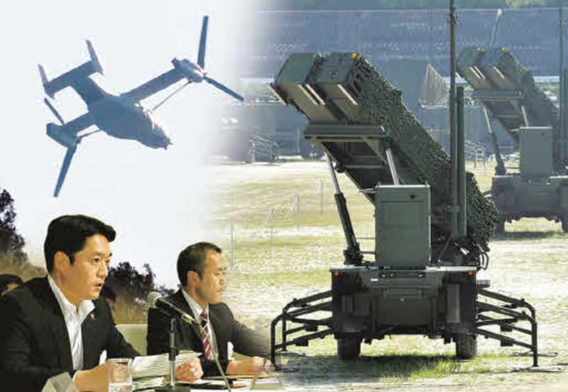 高知県上空を飛行するオスプレイ、高知市での憲法審査会公聴会、香南市に配置されたPAC3のコラージュ(岡崎紗和作成)