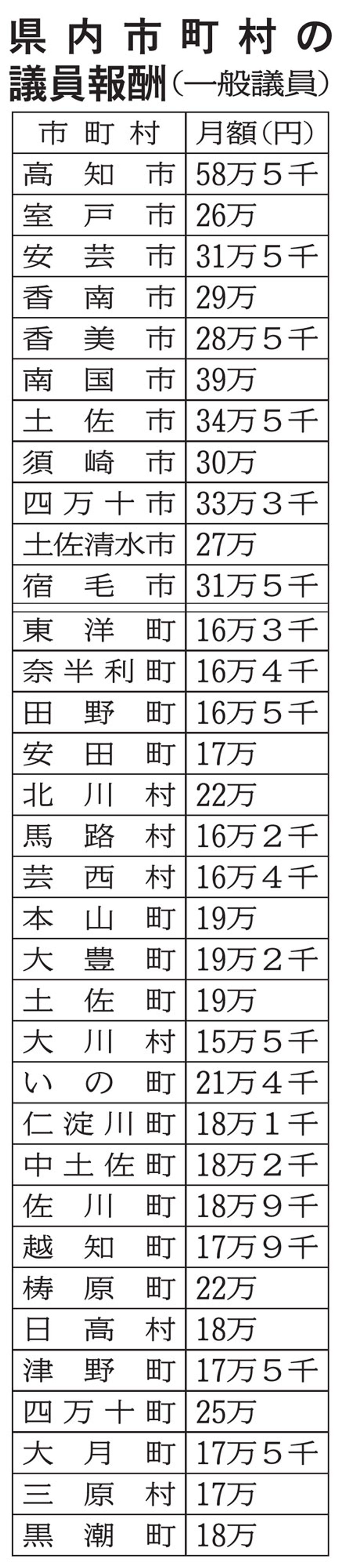 議員報酬の月額は、県議は額面77万円、34市町村では高知市が58万5千円と突出している。高知市議らは「冠婚葬祭費や付き合いの支出も多い」と話すが、町村議からは「議員としての役割自体は変わらないのに…」とうらやむ声も。