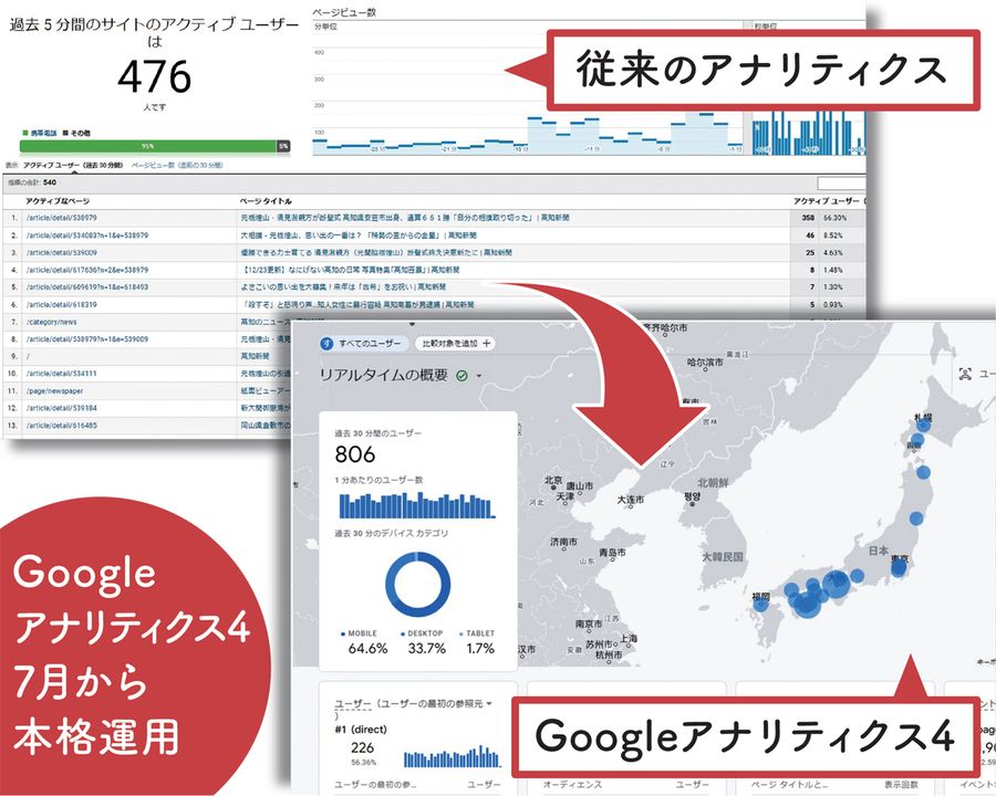高知新聞に載った“地だね”記事をほぼ全てアップし、多彩な限定記事も見られる本紙ウェブサイト「高知新聞Plus」。毎月、この「デジタルPlus」紙面の下部で前月の閲覧状況を解説していますが、記事配信チームは7月から新たな解析ツール「GA4(グーグルアナリティクス4)」を本格的に運用しています。この機会に毎日・毎月のアクセス分析や記事のおすすめ方法など、舞台裏をご紹介します。
