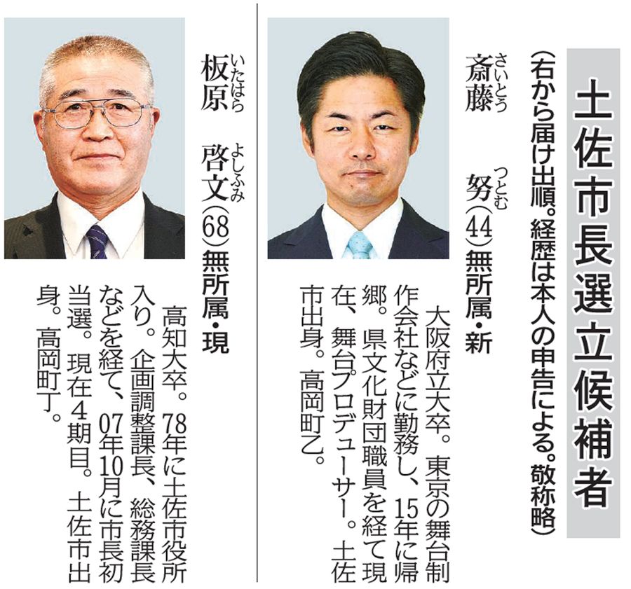 土佐市長選が告示 斎藤氏、板原氏が立つ
