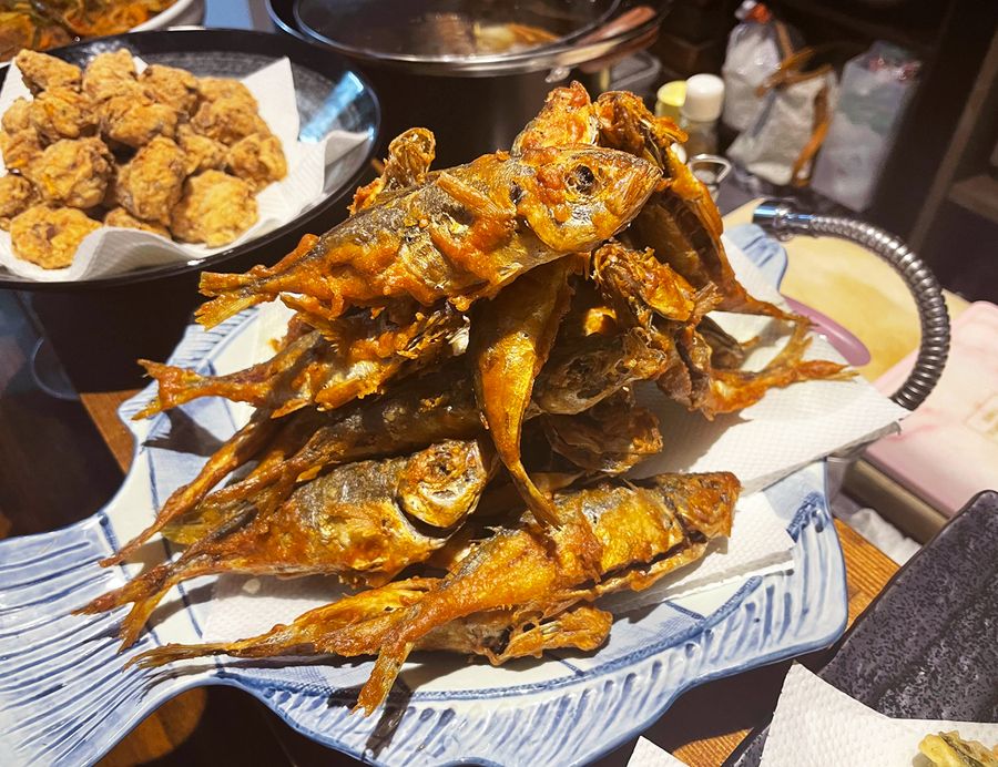 中でもひときわ目を引いたメニューが「鰺(あじ)のおつまみからあげ」。茶色い衣をまとった小アジが、まるでタワーのように積み上げられている。さすがは魚の棚!