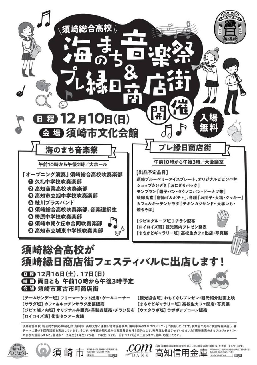 須崎総合高校の生徒が企画。同校や高知商業高のほか、同市や高知市、梼原町、中土佐町の中学校吹奏楽部などが大ホールで演奏を披露する。大会議室では、須崎総合高の生徒が考案した須崎市産ブルーベリージャムのアイス、浦ノ内のイノシシ肉を使ったビビンバ丼、同校食堂で人気の唐揚げやポテトなどを販売。市内事業者から仕入れた「たけのこパン」なども並ぶ。