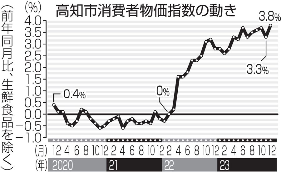 高知市12月物価3.8%上昇 41年間で最高 9カ月連続3%超