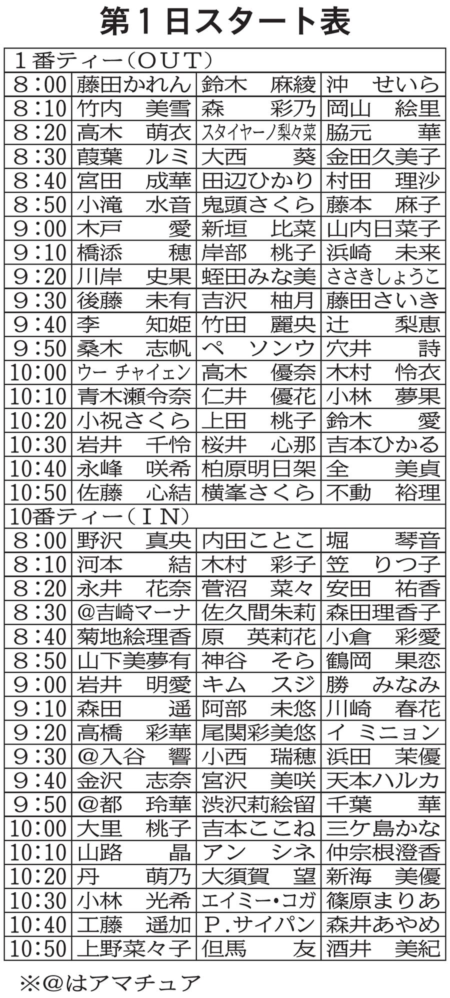 また、09年女王の横峯さくら(明徳義塾高出)が次点補充者で2年ぶりに参戦する。現役永久シードの不動裕理、佐藤心結と同組。開幕戦で6年ぶりにツアー復帰した13年女王の森田理香子は、同大会7位の佐久間朱莉、開幕戦でベストアマを獲得した予選会2位の吉崎マーナ(沖縄カトリック高1年)とプレーする。