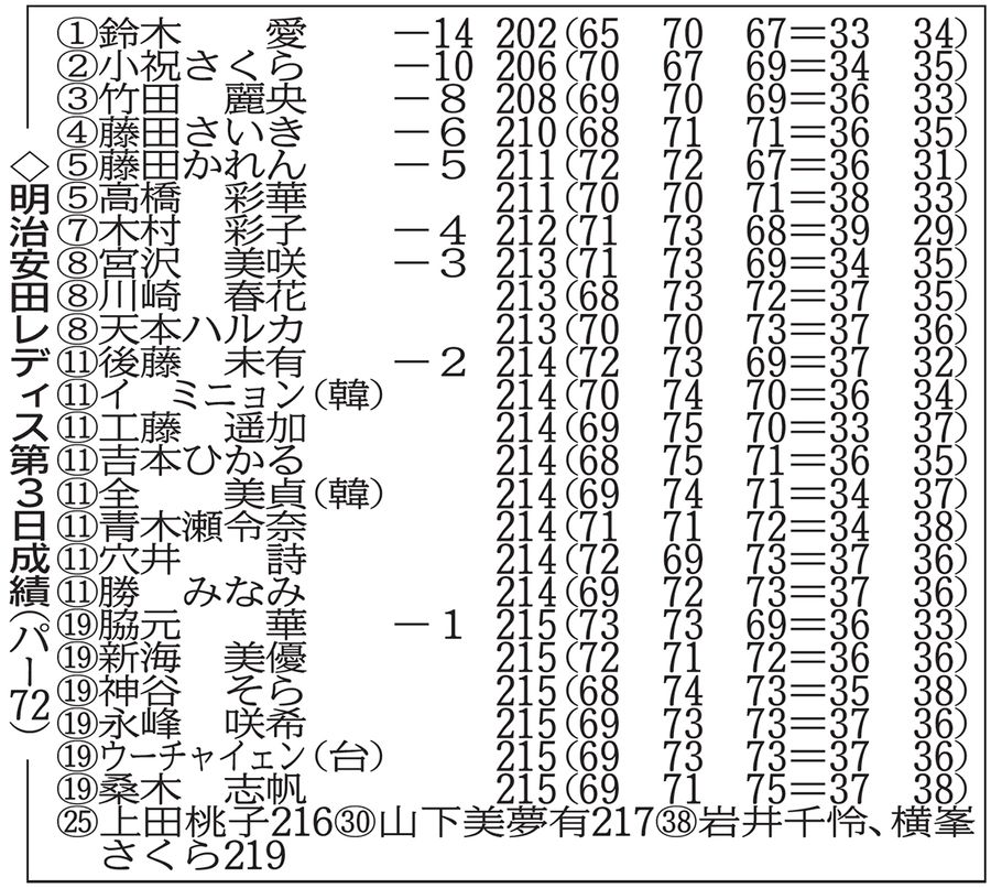 鈴木愛-14 Vへ独走 小祝さくら2位 4打差最終日へ 女子ゴルフ明治安田レディス 第3日