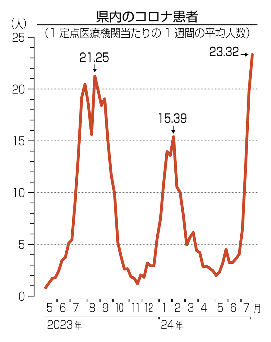 県は44医療機関で1週間の患者数を観測。7月第2週の平均患者数は19・80人で全国平均の11・18人よりも多く、第3週は第9波が到来した昨年8月中旬の週21・25人を上回った。…