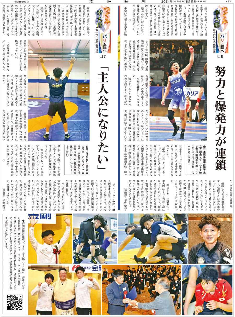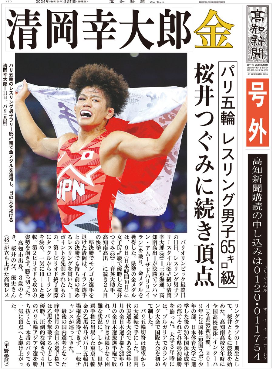 パリオリンピック最終日の11日、レスリング男子フリースタイル65キロ級の清岡幸大郎(23)=三恵海運、高知南高出=が決勝でラハマン・アムーザドハリリ(イラン)を破り、金メダルを獲得した。県勢の金メダルは、9日(日本時間10日)に女子57キロ級で優勝した桜井つぐみ(22)=育英大助手、高知南高出=に続き2人目の快挙。