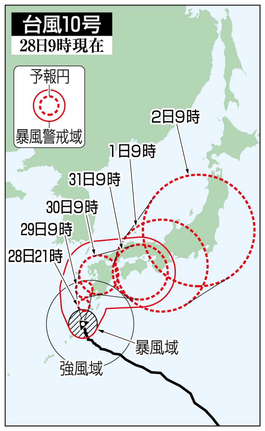 台風の中心気圧は935ヘクトパスカルで、最大瞬間風速は70メートル。30日にかけて九州に北上後、進路を東寄りへ変えて四国方面に進む見通し。