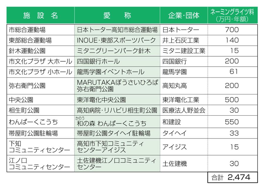 中央公園、わんぱーく...高知市のネーミングライツ企業決定 12施設で年間契約料2500万円