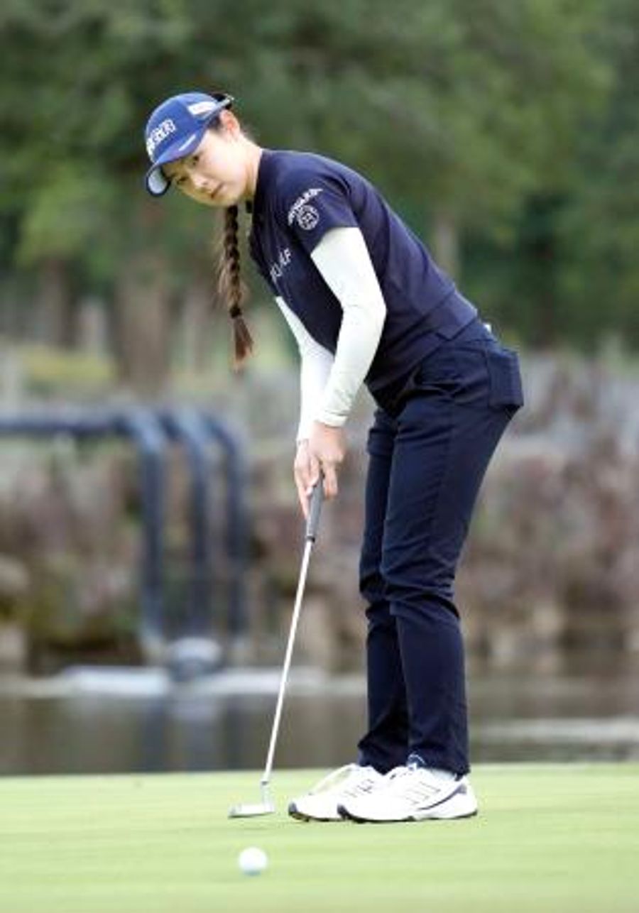 第2日、18番でパットを放つ辻梨恵。通算10アンダーで首位=グレートアイランドC