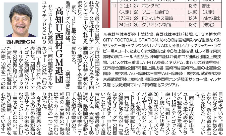 高知Uは2024年2月9日、西村昭宏ゼネラルマネジャーの退団(1月31日付)を発表。四国リーグ・アイゴッソ高知時代の2014年から高知県サッカー界の発展に尽力してきた高知Uの初代監督は「(在籍)10年を一つの節目と考えていた。組織も新たなスタートを切ることから、新たな道に進むことを決めた」としている。