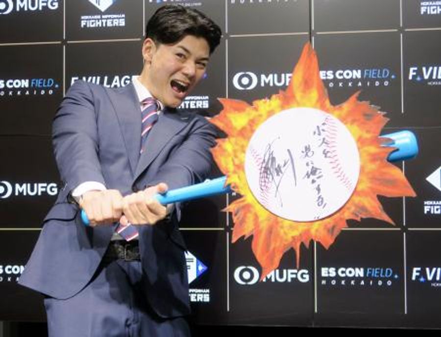 契約更改交渉を終え、ポーズを決める日本ハムの清宮=6日、エスコンフィールド北海道