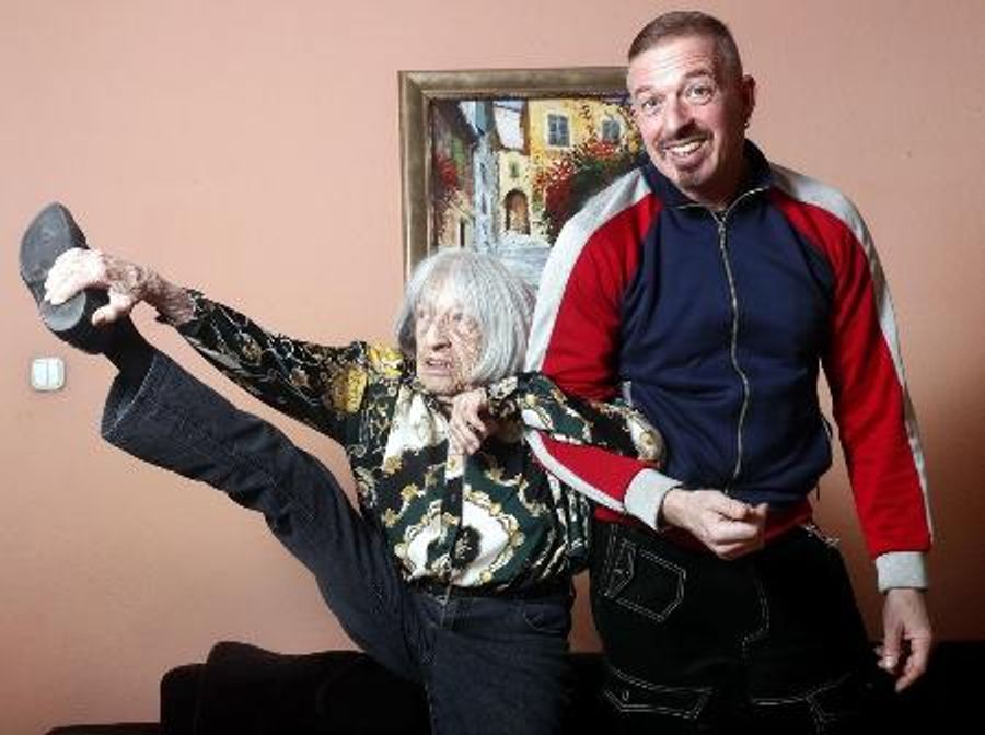 ハンガリー・ブダペストの自宅で体の柔軟性を示すポーズをとるケレティ・アグネシュさん(左)=2020年1月(AP=共同)
