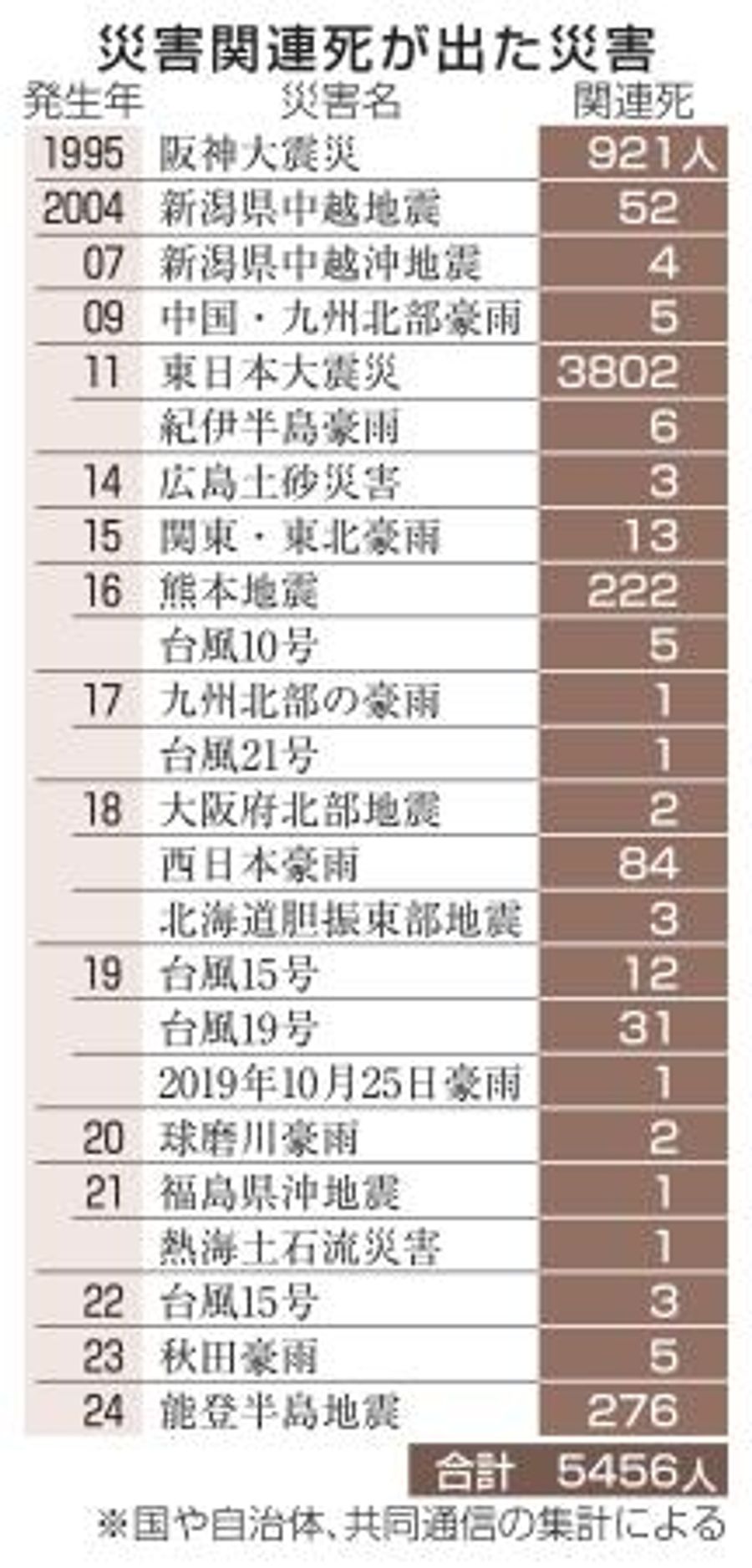関連死と認定されるには遺族の申請が必要で、実際は認定者数以上の死者がいるとされる。11年の東日本大震災など一部を除いて、国として関連死の統計が整備されていないことも課題だ。