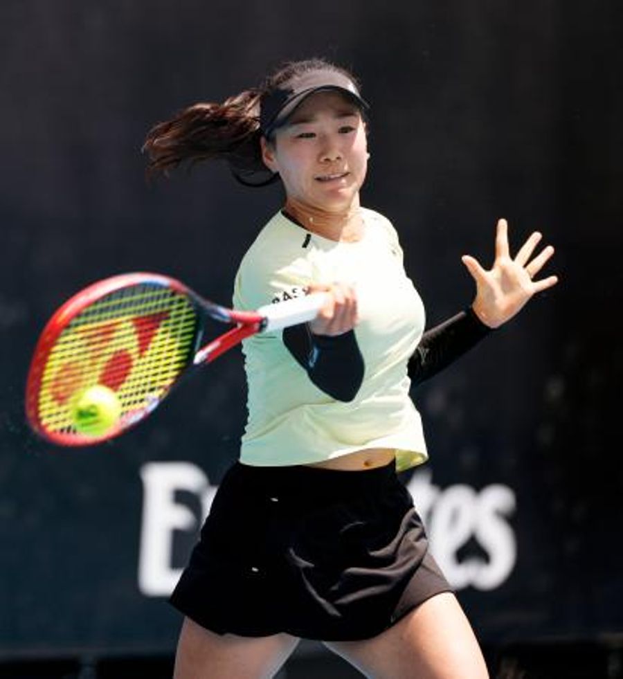 女子シングルス予選2回戦でプレーする日比野菜緒=メルボルン(共同)