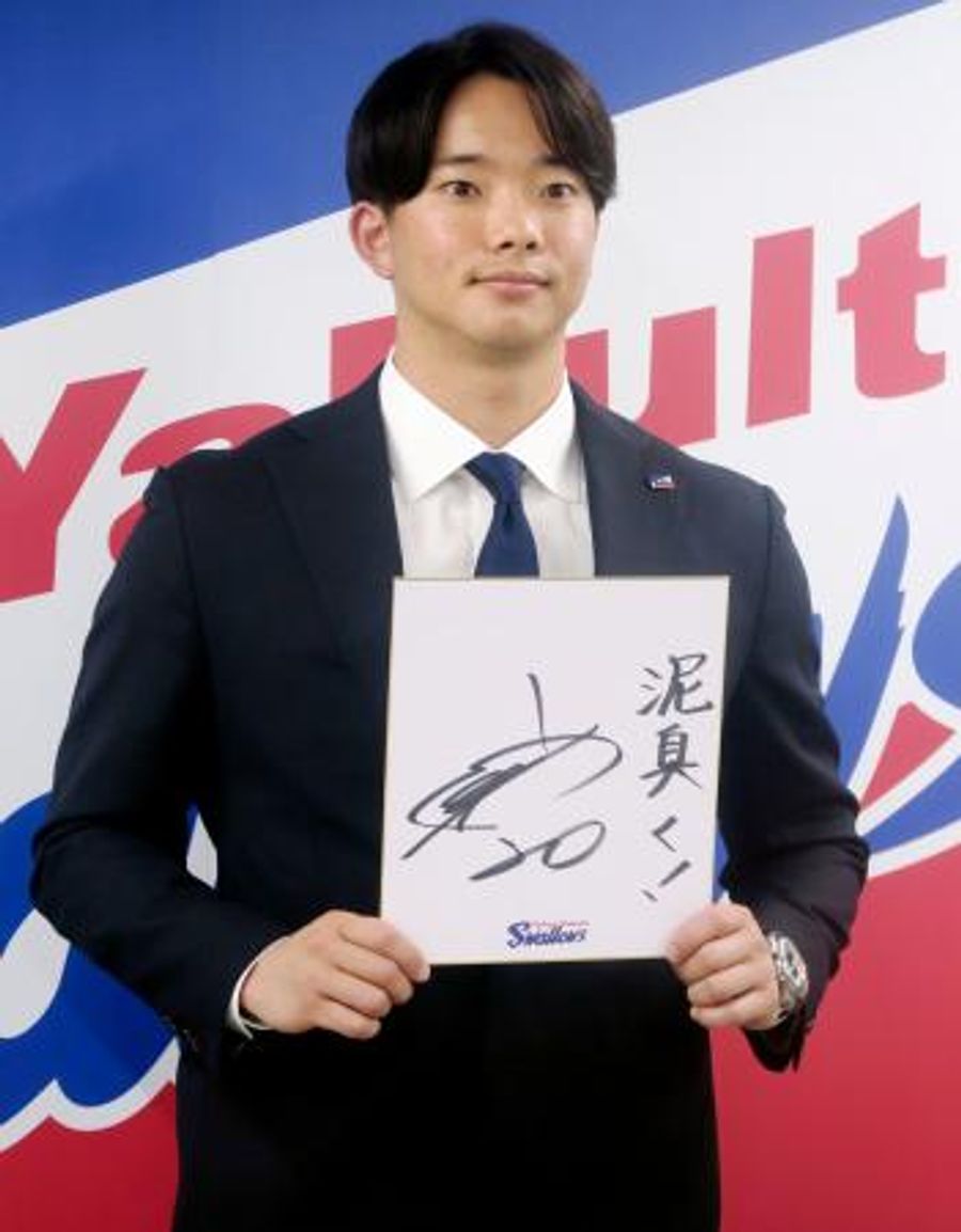 契約更改交渉を終え、今季への思いを書いた色紙を掲げるヤクルト・木沢=8日、東京都内の球団事務所