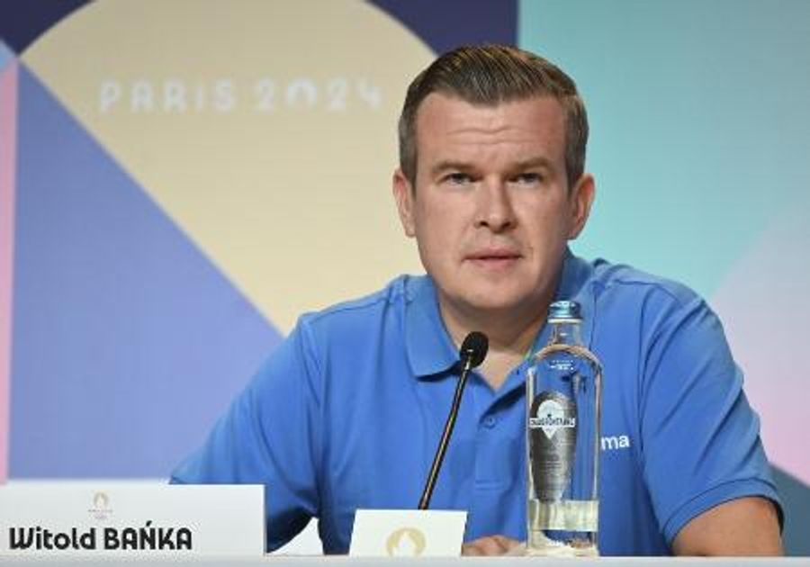 パリ五輪のメインプレスセンターで記者会見する世界反ドーピング機関(WADA)のバンカ委員長=2024年7月