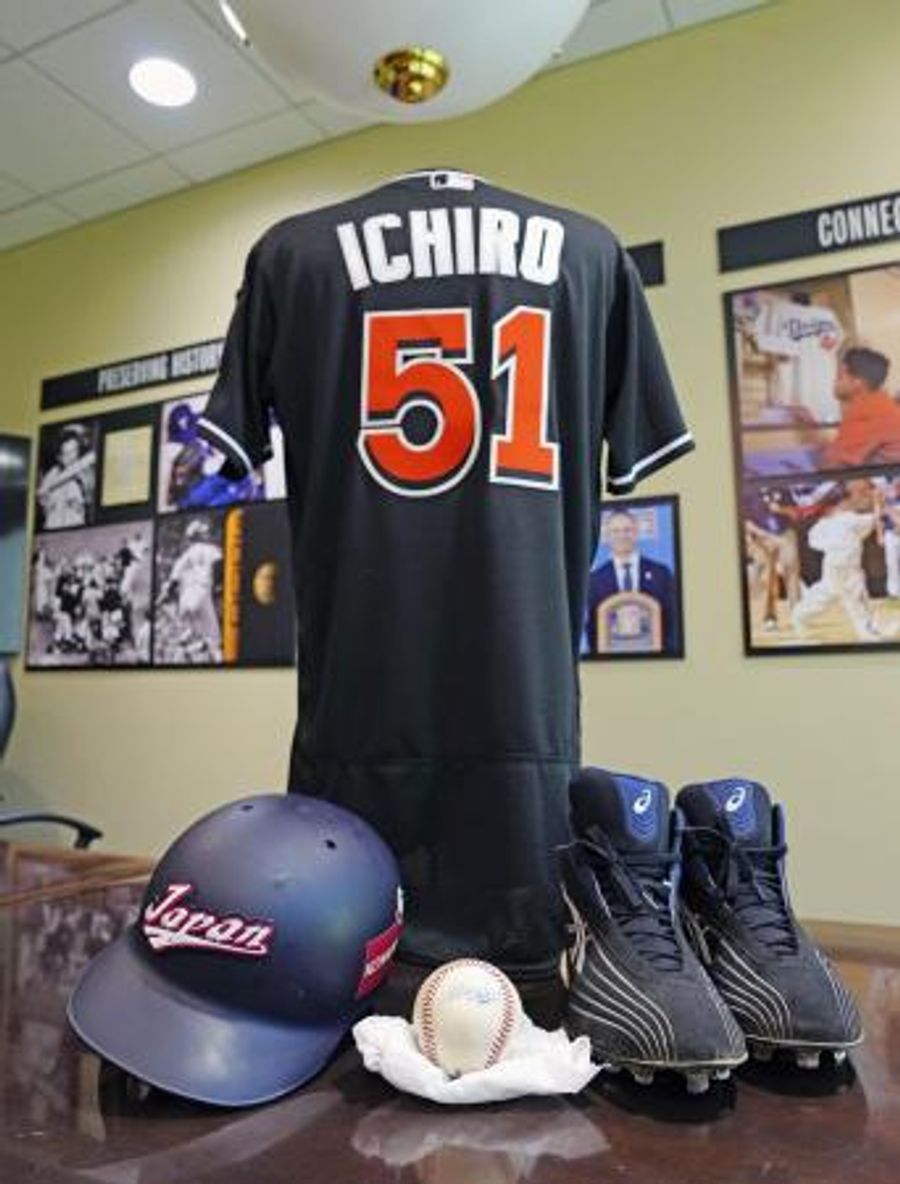 イチローさんが米野球殿堂博物館に寄贈したユニホームや用具=ニューヨーク州クーパーズタウン(共同)