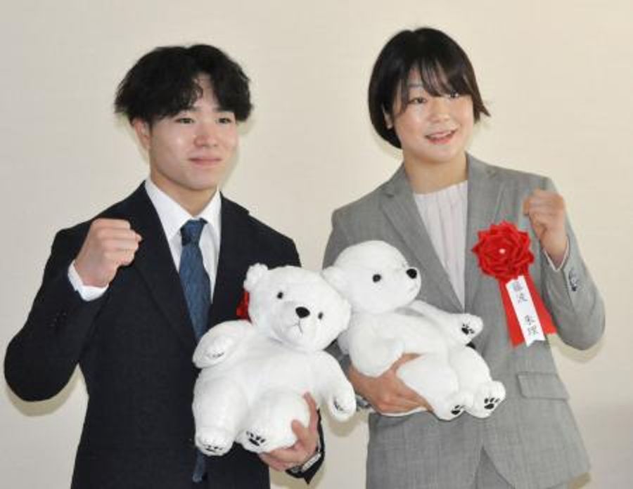 「ホワイトベア・スポーツ賞」を受賞した、体操男子の岡慎之助(左)とレスリング女子の藤波朱理=31日、東京都内