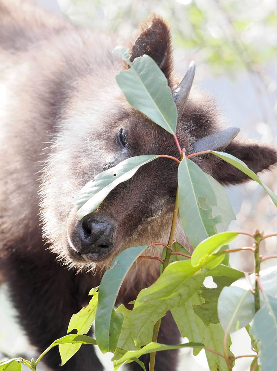 馬路村の会社に勤務する井上貴文さん(50)=ニホンカモシカ「ギンじいさん」の様子に目尻を下げて。国の特別天然記念物だが、…
