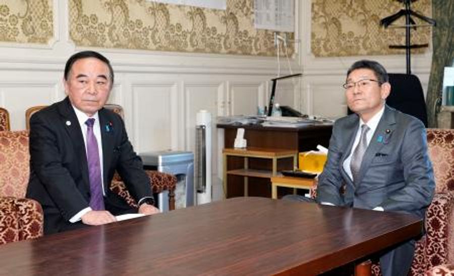 会談に臨む自民党の坂本国対委員長(左)と立憲民主党の笠国対委員長=19日午前、国会