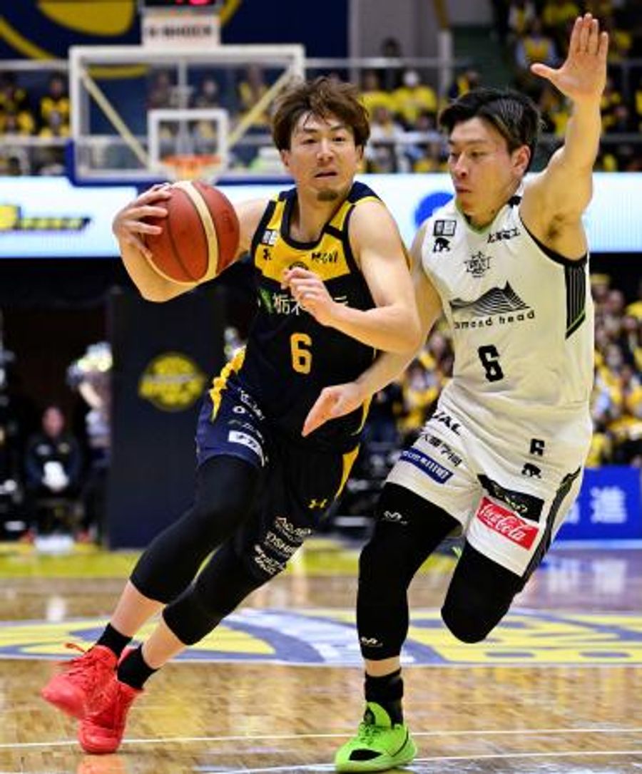 北海道戦で攻め込む宇都宮の比江島(左)=宇都宮市体育館((C)B.LEAGUE)