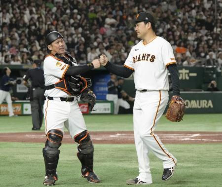 2回を投げ終え、捕手甲斐とタッチを交わす巨人・田中将=東京ドーム