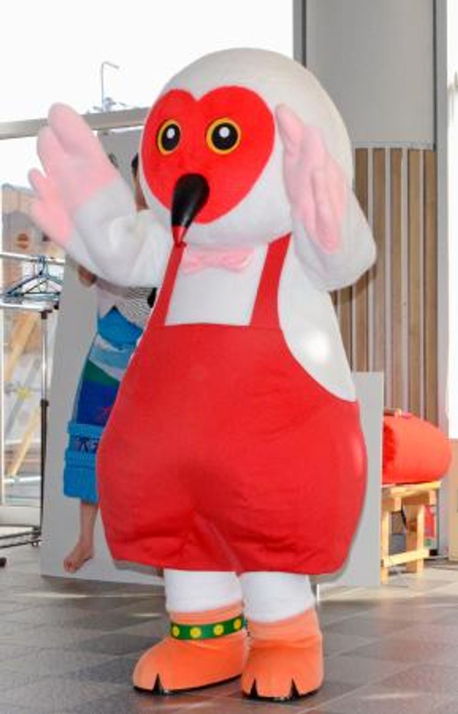 トキ次郎の顔はトキの特徴であるハート形の赤色模様。両手を羽ばたかせると集まった住民から「かわいい」と歓声が上がった。能登トキファンクラブの宮下源一郎会長(77)は「自由闊達で元気に育ってほしいと名付けた。能登が元気になるよう頑張るので、いつでも呼んでほしい」と話した。