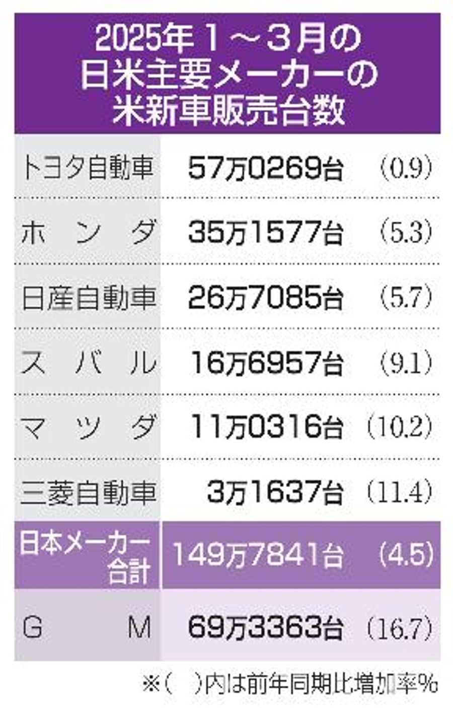 2025年1~3月の日米主要メーカーの米新車販売台数