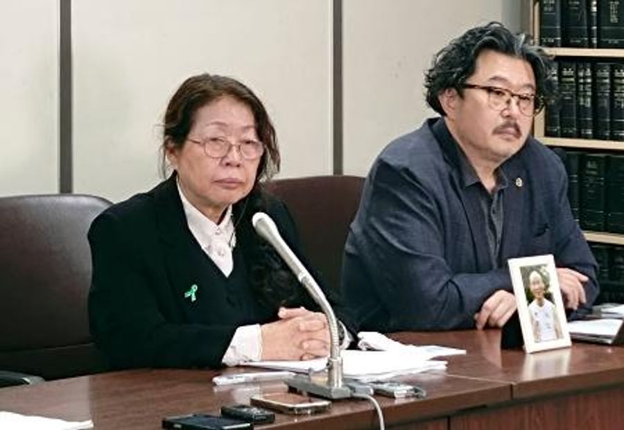 石川一雄さんの死去を受けて第4次再審請求を申し立て、記者会見する妻の早智子さん(左)=8日午後、東京・霞が関の司法記者クラブ