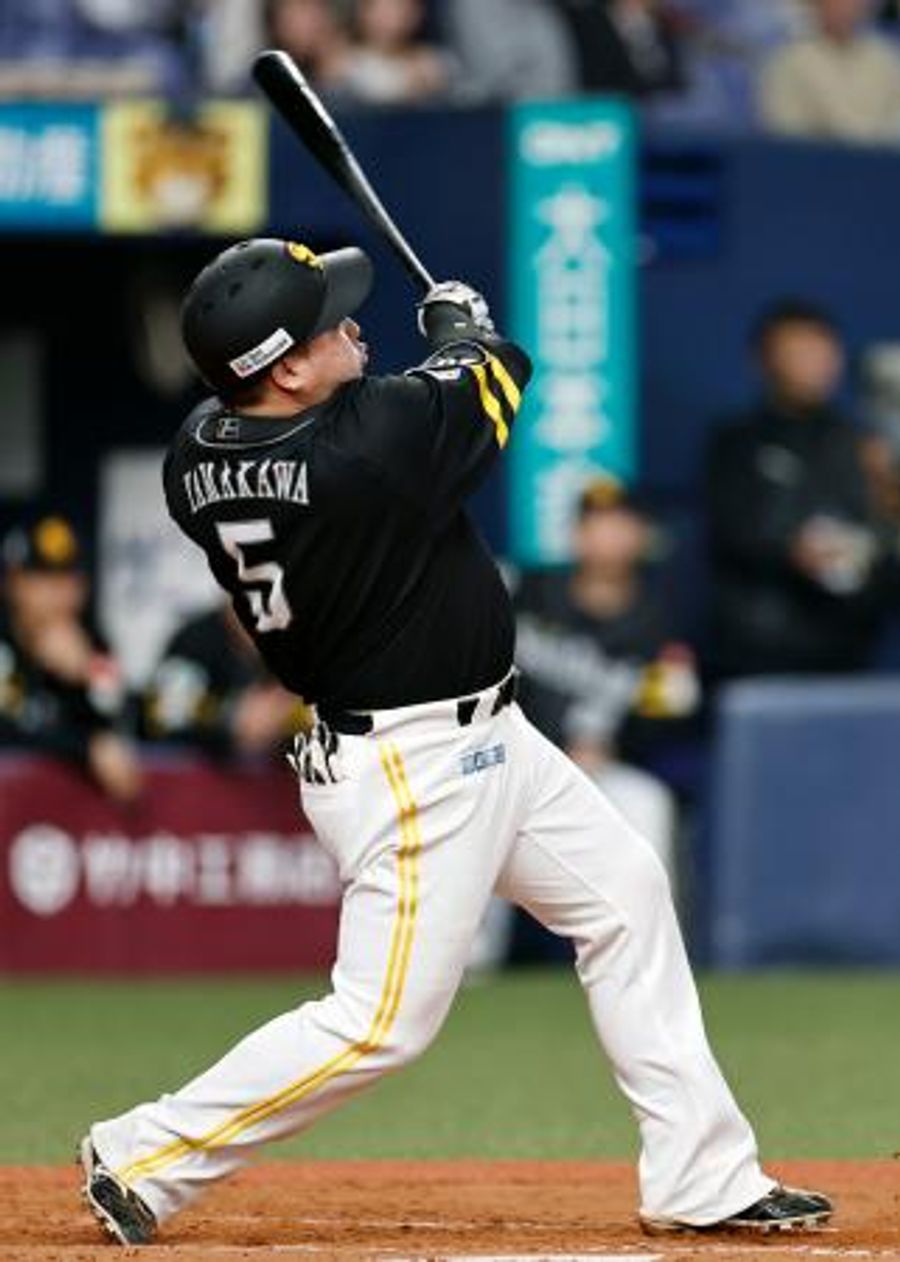 9回ソフトバンク1死一、二塁、山川が左越えに3ランを放つ=京セラドーム