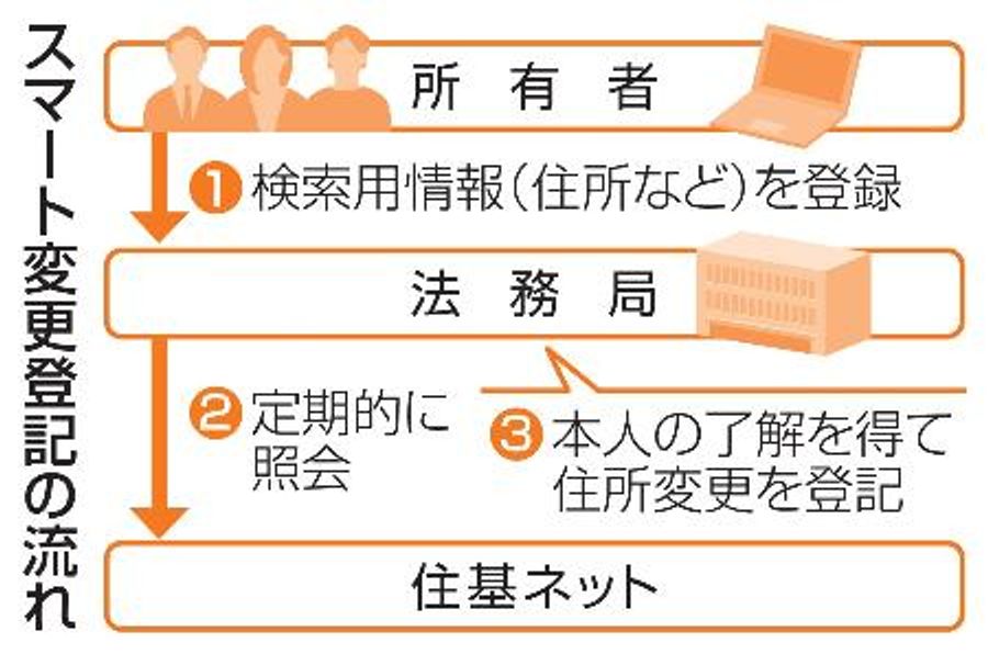 不動産所有者が住所変更した際の登記が2026年4月から義務化されるのを前に、住所や氏名を一度届け出たら以降の手続きが不要となる「スマート変更登記」の事前受け付けが今月21日から始まる。届け出を済ませれば来年4月以降、各地の法務局が住民基本台帳ネットワーク(住基ネット)を定期的に照会。住所変更を確認した際は登記に反映させ、所有者の負担軽減につなげる。