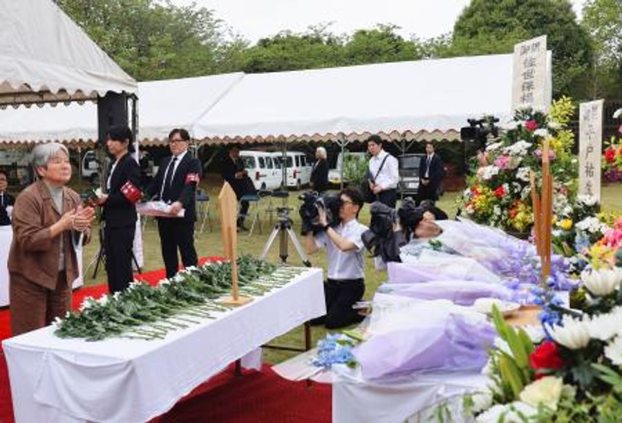 太平洋戦争で捕虜となりフィリピンの収容所で亡くなった日本兵や、引き揚げ途中に命を落とした市民ら約6500人の遺骨が眠る長崎県佐世保市の釜墓地で20日、追悼式が営まれた。参列した遺族は取材に「ここに父がいるのが悔しい」と涙ぐんだ。遺族の高齢化や戦後80年の節目となったことを踏まえ、来年から規模を大幅縮小する。