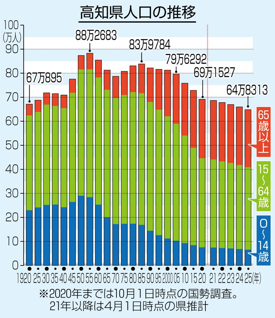 高知県人口が65万人割れ 1年間で1万1279人減 社会減が拡大