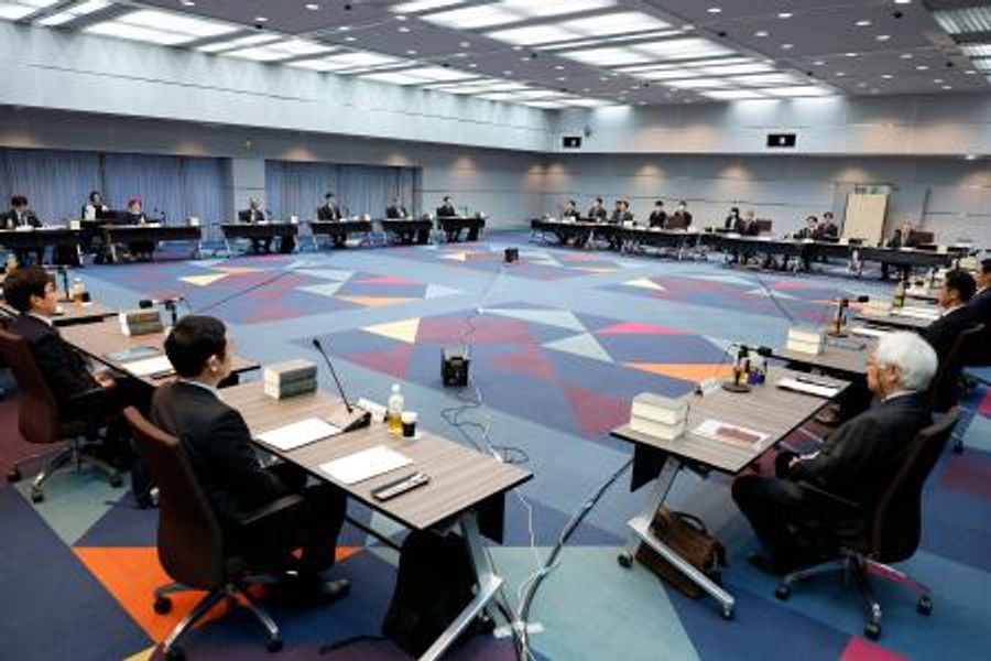 刑事裁判の再審制度見直しを検討する法制審議会部会に臨む委員ら=21日午前、法務省