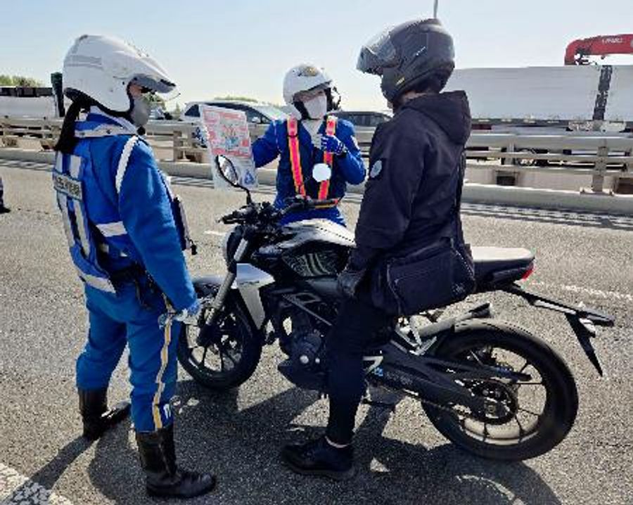 バイクでのツーリングの機会が増えるゴールデンウイークを前に、警視庁と埼玉県警は21日、東京都北区と埼玉県川口市を結ぶ新荒川大橋で、バイクの利用者を呼び止めて安全運転を促す「二輪車ストップ作戦」を実施した。警察官らは「割り込み、すり抜けが原因の事故が多く発生しています」と呼びかけた。