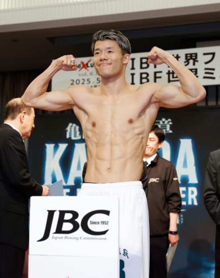 IBFフェザー級世界戦の前日計量をクリアし、ポーズをとる亀田和毅=23日、大阪市内