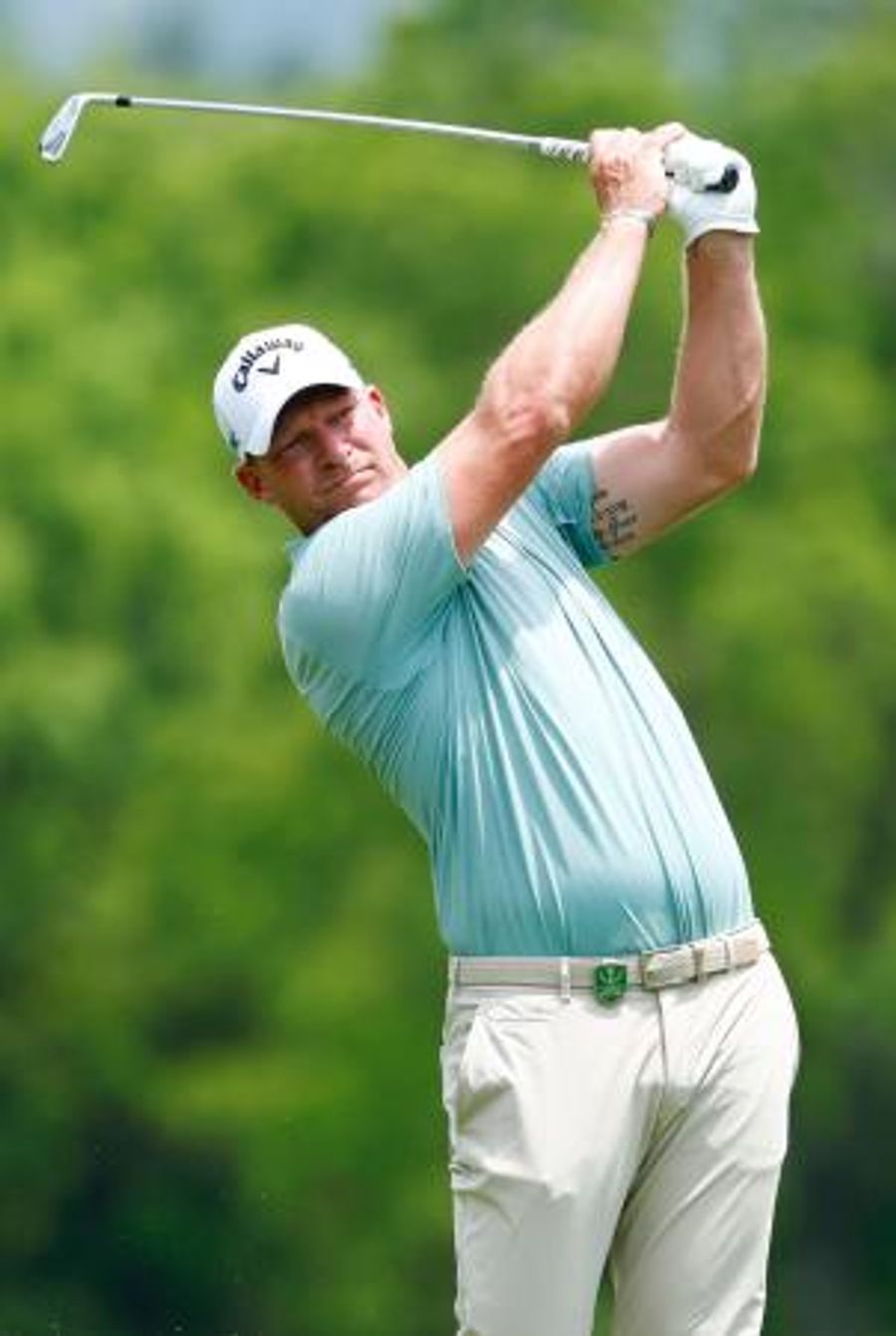第2日、9番でショットを放つショーン・ノリス。通算15アンダーで首位=三甲GC谷汲