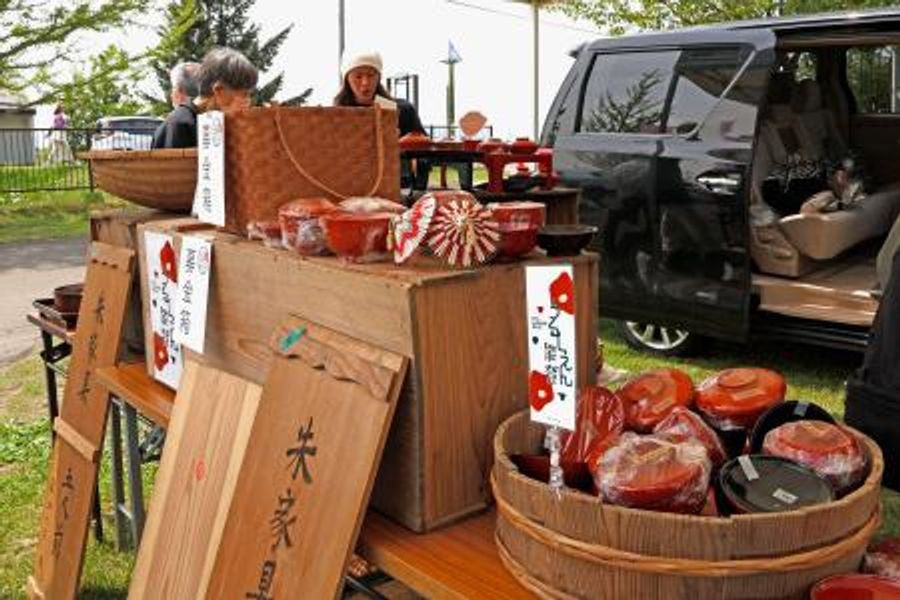 フリーマーケットや屋台でにぎわう「くらし楽しくフェスティバル」の一角に朱色や茶色のおわんが並べられた。次々と訪れた家族連れらが約200年前のものもあるという漆器を手に取って眺め、気に入った商品を購入していた。