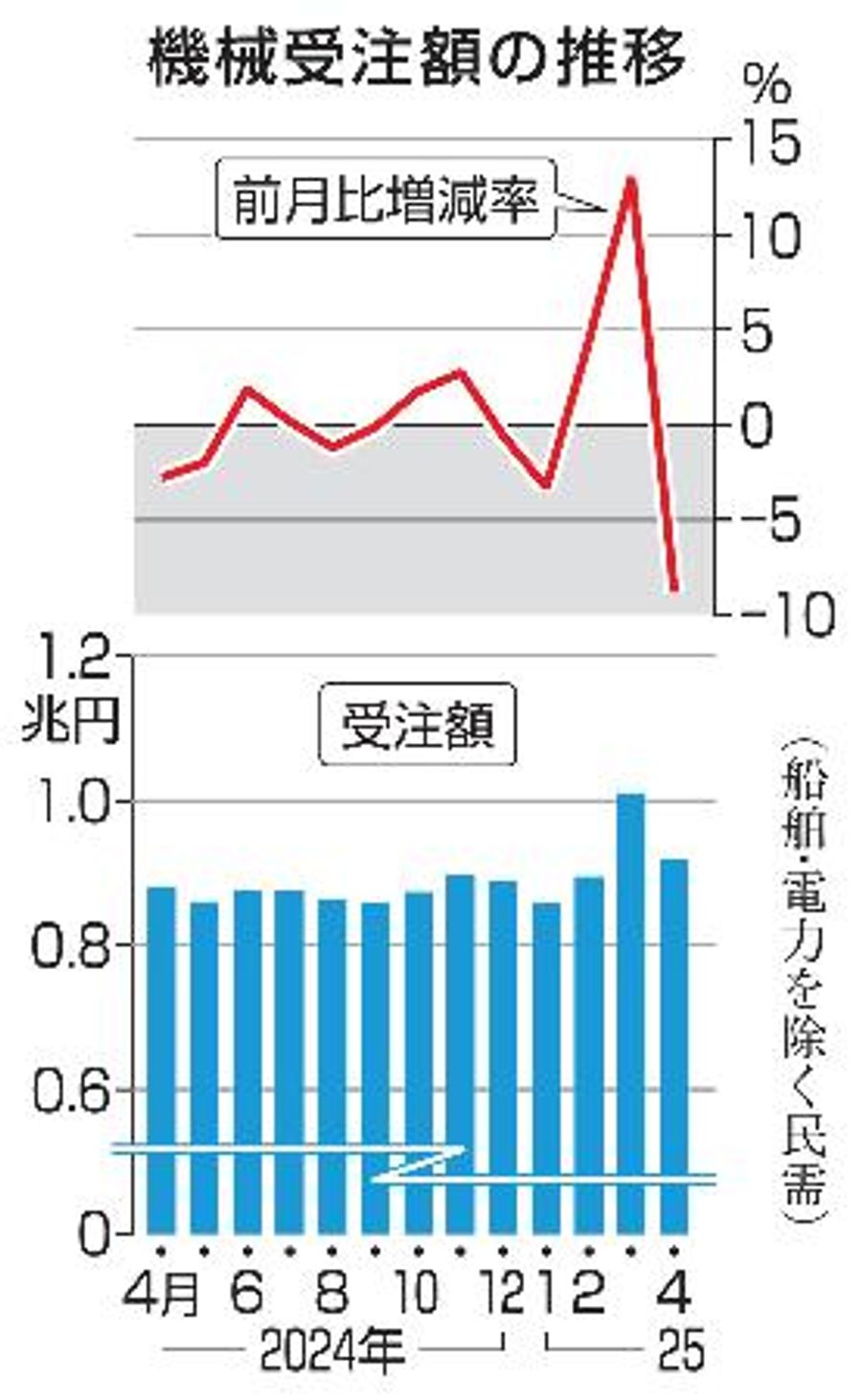 マイナスになったのは、3月に一部業種で複数の大型受注があったことに伴う反動の影響が大きい。トランプ米政権の高関税政策に伴う顕著な受注減の動きは、統計上は見られないとしている。