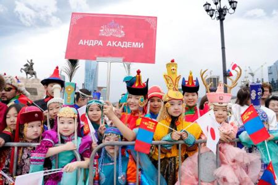 【ウランバートル共同】「陛下、雅子さまー」。モンゴル訪問中の天皇、皇后両陛下が8日、歓迎式典に出席された首都ウランバートル中心部のスフバートル広場。カラフルな民族衣装「デール」に身を包んだ数百人の市民らが両国国旗を振って出迎え、在留邦人からも歓声が上がった。