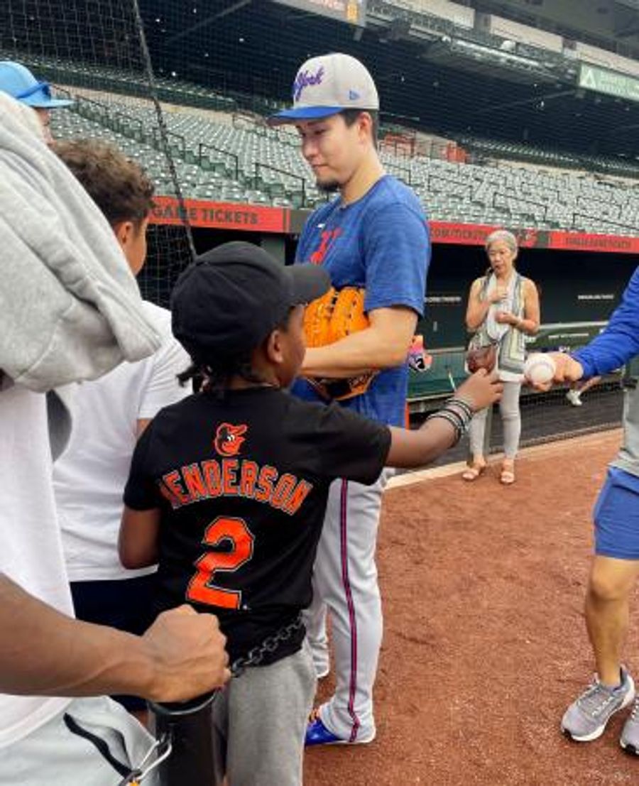 中止となったオリオールズ戦前に、サインの求めに応じるメッツ・千賀=ボルティモア(共同)