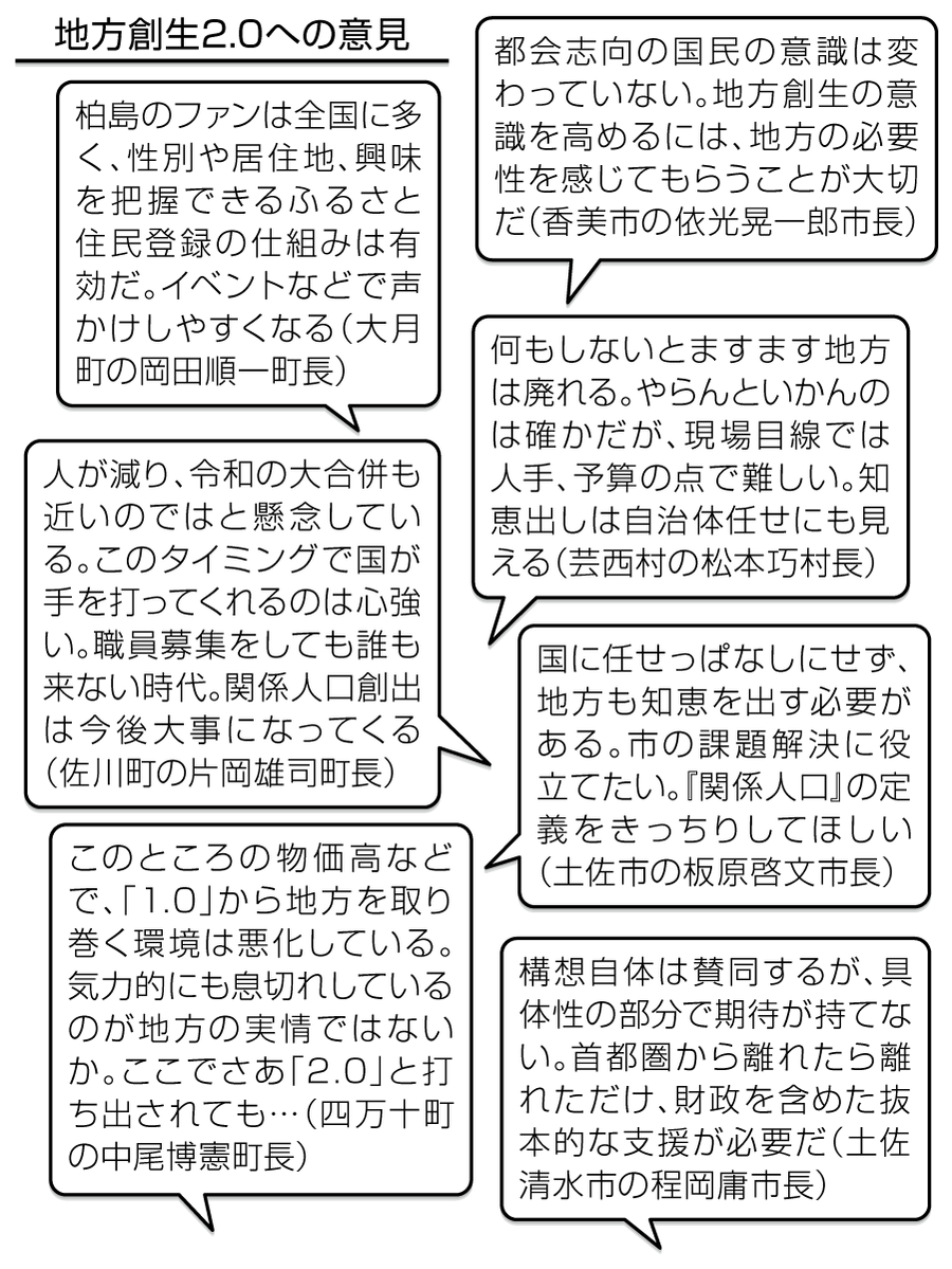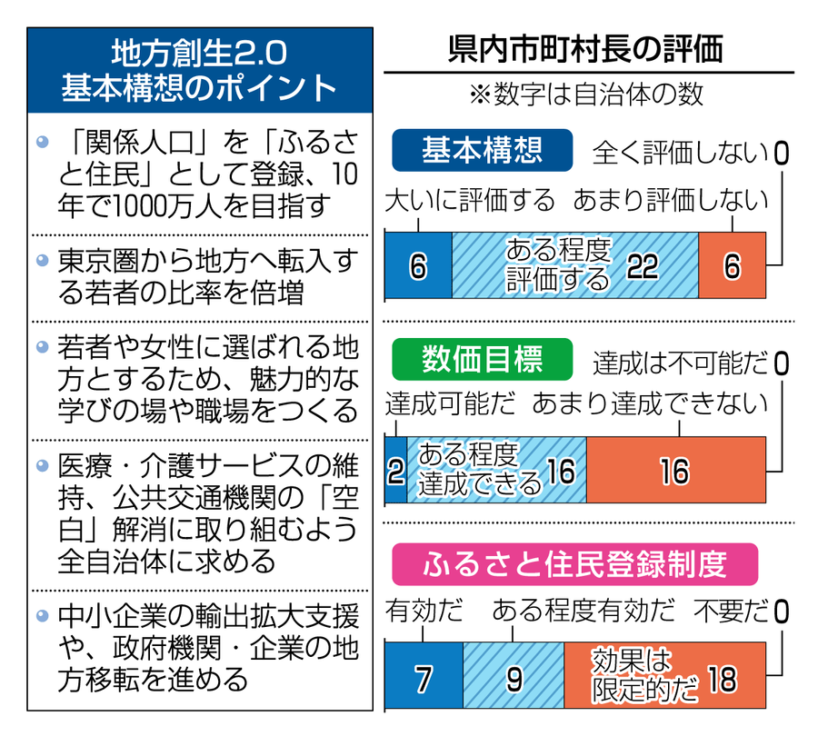 政府の看板政策「地方創生2・0」は「関係人口」の拡大などを目指す。県内の市町村長に意見を聞くと「本気度を感じる」「伴走支援はありがたい」と〝地方ファースト〟の姿勢を評価する声の一方、「ピンとこない」「『国から目線』は変わっていない」と懐疑的な見方も。具体的な財政支援や制度設計への注文が相次いだ。