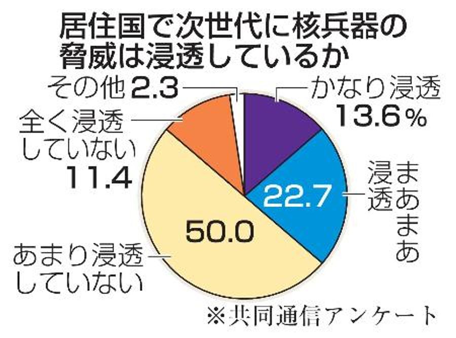 回答は「あまり浸透していない」50・0%、「全く浸透してない」11・4%。記述では「国民のほとんどが戦争経験がなく、原爆投下の事実さえ知らない人も多い」(ブラジルの82歳男性)、昨年の日本原水爆被害者団体協議会(被団協)のノーベル平和賞受賞についても「大多数の人は注意を払わなかった」(米国の87歳男性)とあった。