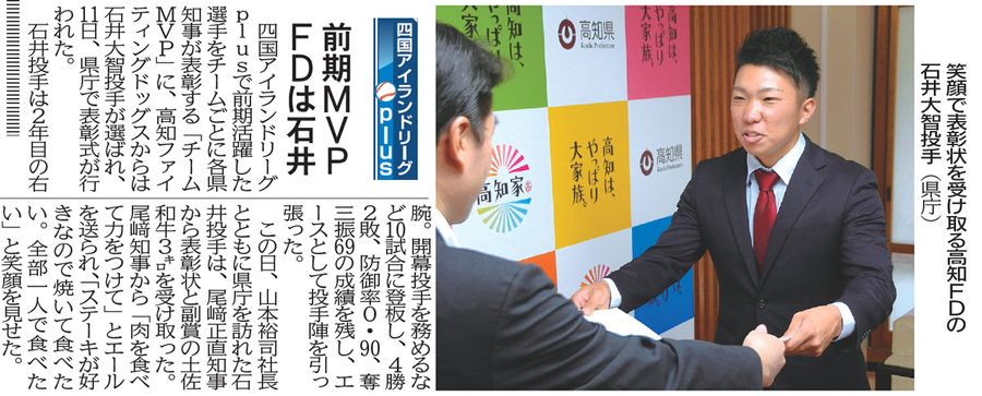 石井投手は2019年前期のチームMVPに選ばれ、7月12日の紙面で高知県庁で表彰されたことが紹介された。知事から表彰状と副賞の土佐和牛3キロを受け取った。そう、土佐の名産が後の剛腕の礎を形成したと言っても過言ではあるまい。
